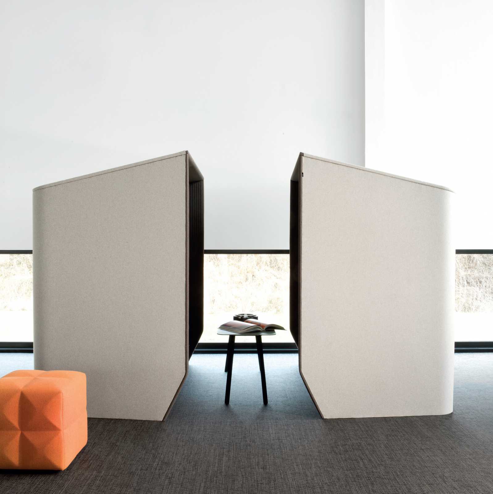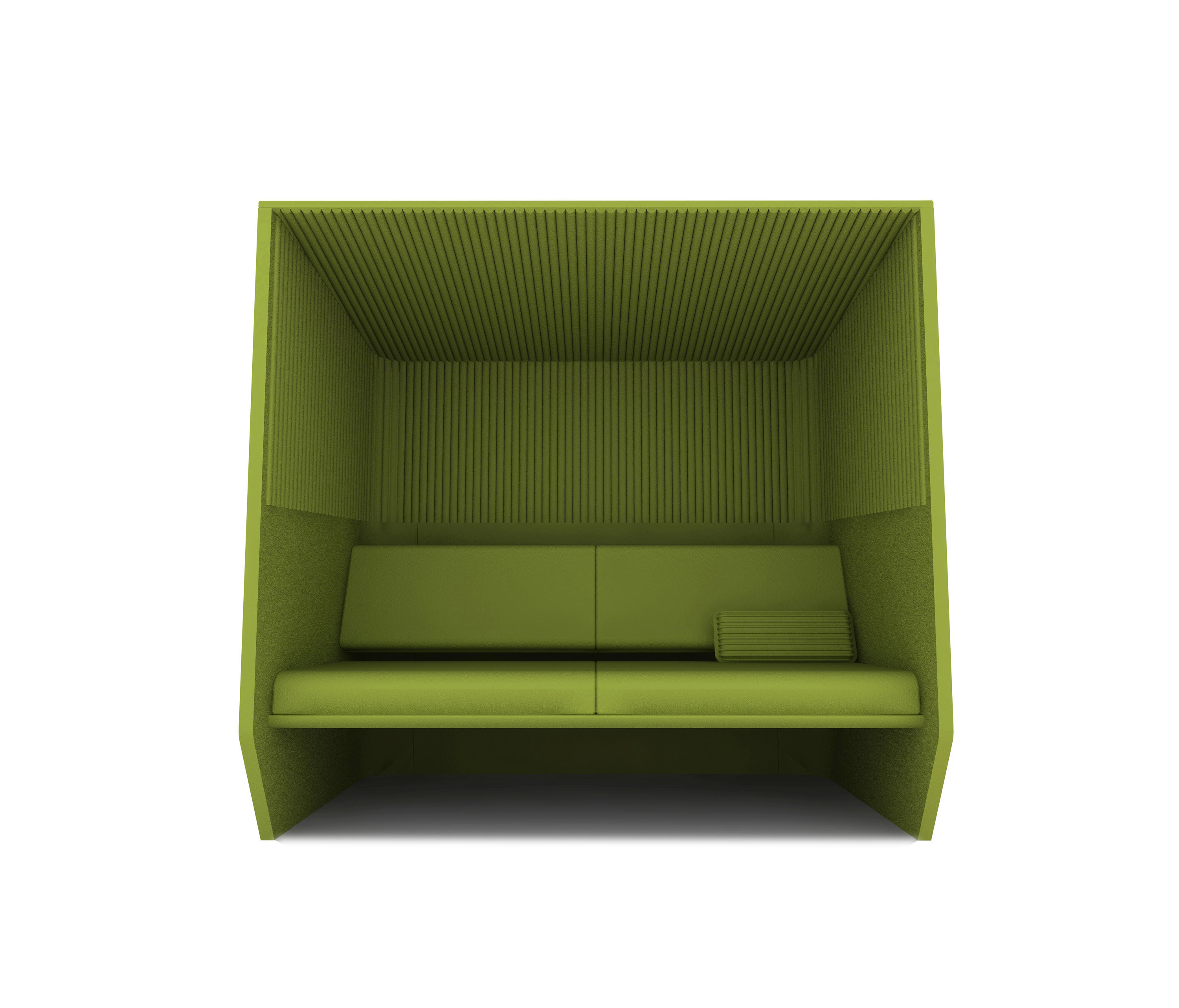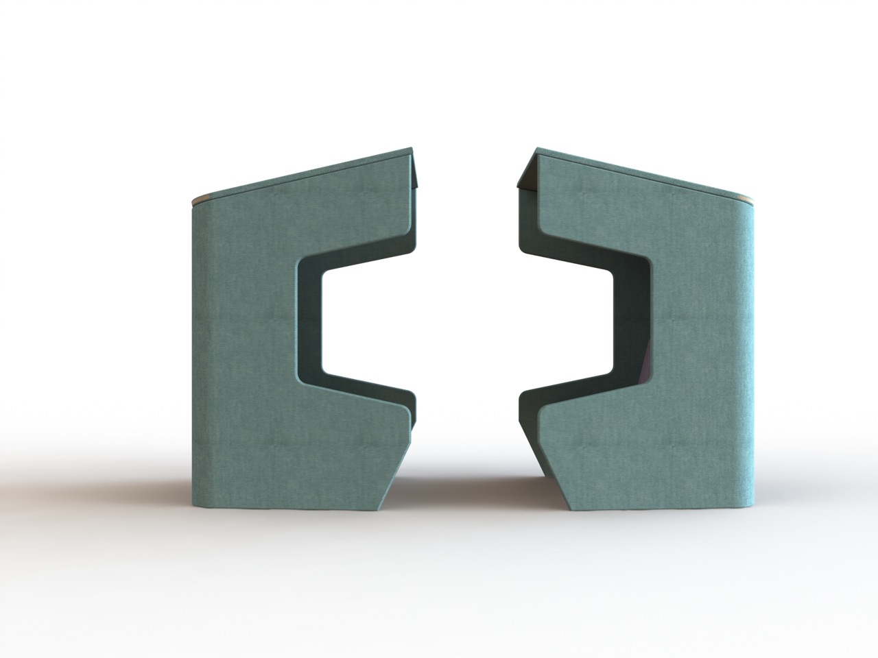 Like the original BuzziVille, a lounge-like seat is enclosed within a three-walled environment for individual or group privacy in open floor plan environments. The new design allows for greater connectivity to the workspaces with cutaway walls.